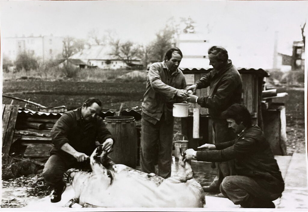 Falusi disznótor Kövecsesen az 1980-as évekből. A böllér Kuhin Béla bal oldalt, bal oldalról továbbhaladva Kiss János majd a házigazda Szabó Zoltán és Fürjes István a jobb oldalt.