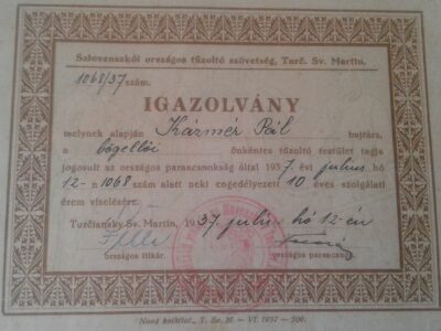A képen Kázmér Pálnak (1905) az önkéntes tűzoltóságban végzett munkásságáért cserébe kapott 10 éves szolgálati érmének igazolványa.